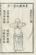 最早的《易筋经》中到底有没有导引图?如果没有,又是什么时候增加的?其来源于何处?到底有多少式?这些问题,不仅民间缺乏了解,即使在某些学术著作中,对《易筋经》与导引图的关系也缺乏准确的解释。如1999年版《辞海》解释:易筋经是"一种传统的强筋壮力的锻炼方法。以某些特定姿势结合调心调息,加强人体筋骨和脏腑的功能。有韦驮献杵(三式)、摘星换斗、三盘落地,……十二势。"[1]这种提法到底对不对?必需经过仔细的考查研究,才能做出回答。笔者经眼48种现存《易筋经》传本,对其最早传本及相关避讳、序跋问题做了系列考查[2,3]。在此基础上,结合其他多种中医养生导引古籍,对《易筋经》导引图做了以下考证,与同好者分享,并欢迎批评指正。