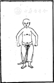 《易筋经外经图说·外壮练力奇验图》第1势云:"第一式:面向东立,目上视,两脚站平,宽与肩齐,不可参差,两手垂下,肘微曲,掌背朝上,掌心朝下,指尖仰翘朝前,默数四十九字,每数一字,指想朝上翘,掌想朝下按。如此四十九字翘,四十九按。四十九宫也。"[12]而《全图易筋经·易筋图说》第1套第1势云:"面向东立,首微上仰,目微上视,两足与肩宽窄相齐,脚站平,不可前后参差,两臂垂下,肘微曲,两掌朝下,十指尖朝前,点数七七四十九字,十指尖想往上跷,两掌想往下按,数四十九字,即四十九跷按也。"[13]文字虽略有差池,意思则完全相同。