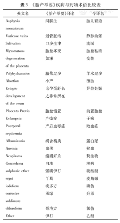从表3、表4可见,疾病名称和产科技术的翻译多以词组居多,译者对此处理较为灵活,对Asphyxia neonatorum(闷脐生),Anesthesia(蒙没知觉),Antiseptic(辟毒)的翻译较为形象,译者在尽可能反映英文词义同时,还结合上下语境,加入自己对一些概念的理解。Episiotomy(割开会阴), Embryotomy(碎小胎儿), The Cesarean section(剖腹取儿法)已与今译名相近。但是Puerperal septicemia(产后血毒症),Albuminuria(蛋白尿)这些疾病的翻译还囿于传统中医的认识,无法让读者准确理解西医学知识,中医对"毒"的认识甚为模糊,一切可能致病的因素都可称为毒,这一翻译不能反映出西方微生物学对细菌的最新认识,同样"精质"也无法明确代指蛋白质这一营养成分。对于药物名称的翻译,多参考嘉约翰的《西药略释》及洪士提反的《万国药方》,主要采用音译法,沿袭合信等人的翻译原则。