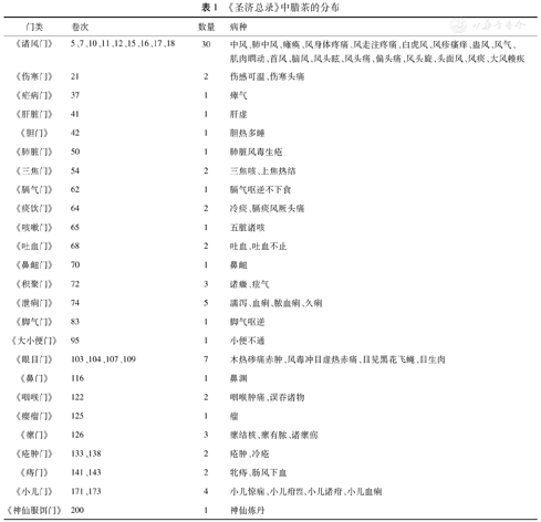 《圣济总录》是宋徽宗赵佶敕编的大型方书,全书66门,200卷,记录药方近20 000首,涉及到腊茶相关的方剂有79首。其分布如表1。