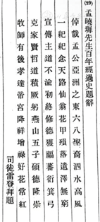 孟目的父母都笃信基督教,父亲孟继曾是北京基督教公理会(Congregational Church)终身名誉牧师,他一生致力于教会事业。1919年司徒雷登(John Leighton Stuart,1876—1962)接受教会的委派,合并北京汇文大学、通州华北协和大学、北京华北女子协和大学等几所教会大学建立燕京大学,出于教会工作关系,孟继曾在燕京大学的选址、筹款、与地方政府的沟通等方面予司徒雷登多方帮助,遂成好朋友。燕京大学成立时,受到邀请并贺诗4首(图3,据《翠文集珍:弘道堂:孟》1940年,18页,为一本仅流传于家族内部的书)。孟继曾之父亲孟传真百年诞辰,司徒雷登还送来了题词(图4,原文登载于孟继曾主持编写、吴雷川敬题《孟公晓墀百年经过史·续编》序文第15页第29位题词人),后来孟继曾三子孟广礼服务于北京基督教青年会,也是因工作时常与司徒雷登联系,并常常一起打桥牌,成为忘年交。