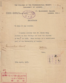 据《孟目的自述》中记载:1919年孟目的来到伦敦,当时英国的药学分为4年学校教育和药学会药科教育,教学程度相近,但参加药学会教育只要个人努力,在校学习的时间可以大大缩短,考虑到经济方面的原因,孟选择了后者。英国药学会药科学校开设系统药学班课程,考试及格发给国家药师开业许可证,同时加入该会后学校会帮助介绍实习场所,要求学生在药厂、药房实习不得小于4 000小时。经过半年的辛勤学习,1920年初孟目的参加了伦敦大学药科学校的入学考试,基本科学部分(化学、物理、植物等)及格后,再准备文学部分考试,包括第二外国语、历史、英文。8个月后孟目的取得入学资格,在药学会注册后被介绍到爱兰汉伯利药厂实习,晚间学习化学、物理、植物等课程,一年后正式入学(图7)。药学会学校的课程只有药学必修课,并且以试验为主,每日2小时听课,6小时试验,工作量非常大,英国当地学生可以在自己的家族企业实习,可以长时期积累,但对外国学生来说在短时间完成实习任务却异常困难。幸运的是孟目的从青少年时代就坚持远足、锻炼身体、即使是在冬天也坚持洗冷水浴,有一副健康的身板,在英国的学习的这段日子里,他熬夜奋战、吃住都在药厂,经过一年半的拼命努力,于1923年通过了毕业考试(图7),并参加了英国政府药学考试(只有5%及格),合格后取得了英国政府的药物化学师和英国皇家药学会会员资格(图8),成为该会第一位中国会员。然而,孟目的最初寻找工作时并不顺利,便继续在爱兰汉伯利药厂和调剂部实习了近1年的时间。