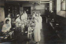 孟目的完成第一次考察回到国内时,卫生实验处的新楼已初具规模。他随即开始投入布置药物化学系实验室的工作中。首先参照国外模式结合国内实际拟出工作计划,任务以学术研究、训练人才为主;再配合署内实验药厂开展新药试制工作,同时承担市场常用药品和食品的抽样和化验工作。他首先建立各种动物房,训练生物测定人员(图10),最初他还可以每天在实验室工作半天,不久奉派兼了很多行政职务,包括中央医院药房主任,从此脱离实验室,只做教学工作。而药物化学系的主要工作也只是配合成药登记、作毒性试验和法院及禁烟委员会等机关做法医化验工作[6]。此时,卫生署实验处附属机关渐多,衙门大起来,官僚作风发展起来,人浮于事,互相排挤。某日中央医院药房仓库失火,孟目的被免去中央医院药局主任职务。
