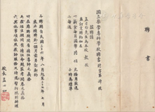 在药界的的呼吁下,1936年初,政府终于批准在南京建立国立药学专科学校(以下简称药专),招收高中毕业生,学制4年并附设药科药厂。7月13日组织筹委会,孟目的被任命为主席,薛培元、朱章赓、陈思义为筹备委员。行政院拨款2万6千元为筹备经费。8月租赁南京白下路盐业银行旧址,经过修缮,作为临时校址[19]。8月21—23日,在北平、南京两地举行招生考试,考试科目有党义、国文、数学、英语、物理、化学、生物学,北平有考生108人,南京有333人,9月1日,录取首届新生揭晓,共正取40名,备取15名,录取率仅为9.07%[20]。1936年9月2日教育公报发布了聘请孟目的为药专校长的聘书(图15),9月17日举行开学典礼(图16)。