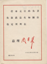 1962年卫生部药品检验所与生物制品研究所合并为卫生部中国药品生物制品检定所,两所合并后,孟目的继续担任所长,任命书由总理周恩来签署(图23)。不久"文化大革命"开始,到20世纪60年代后期,孟目的受到批判,被迫打扫院子和厕所,冬天用手推车为锅炉房拉煤,一家人也从原来的住所被赶出来,搬到一间没有暖气、见不到太阳的小仓库内。这些孟目的都可以乐观地面对,但让他不能接受的是他的一些同事在政治运动中被批判、被批斗,特别是当他得知他的学生徐玉均非正常死亡的时候扼腕痛惜(图24)。徐玉均是药专的第一届毕业生,1945年留学英国。1950年获伦敦大学药学院理学博士学位,同年回国受到老师孟目的邀请来中检所工作,担任药理室主任,是中检所的技术骨干,是新中国药品生物检定工作的开创者之一。他曾任中国药学会理事兼副秘书长,1957—1960年任《药学通报》主编,是孟目的的得意门生。1979年,孟目的恢复工作,虽然名誉上还是所长,但实际上已不管具体事务了,但是他还是尽自己之力为那些在运动中失去生命的同事们恢复名誉。