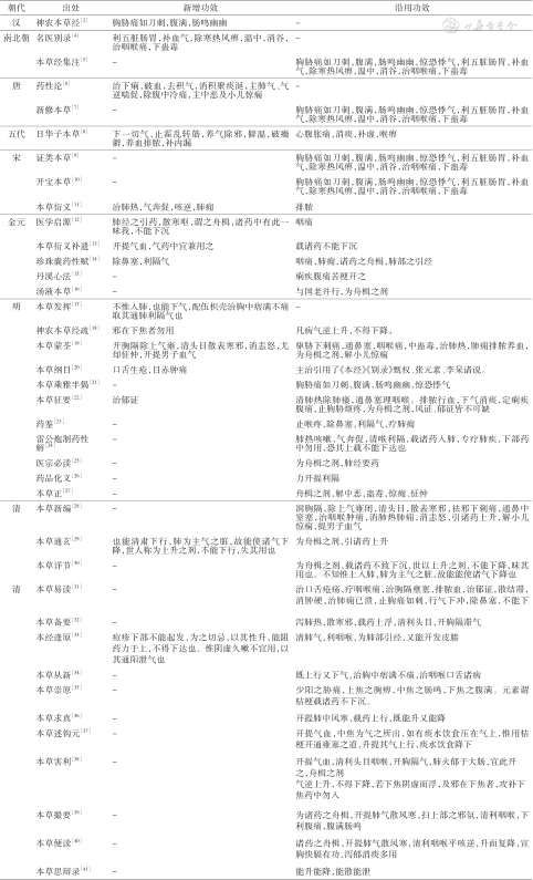 | 清 | 本草新编[28] | - | 润胸隔,除上气雍闭,清头目,散表寒邪,祛邪下刺痛,通鼻中窒塞,治咽喉肿痛,消肺热肺痈,消恚怒,引诸药上升,解小儿惊痫,提男子血气 |