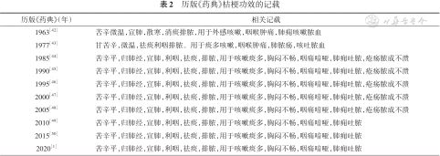 到了现代,桔梗的功效在教材与《药典》中已趋于一致,表2为历版《药典》,记载的桔梗功效。