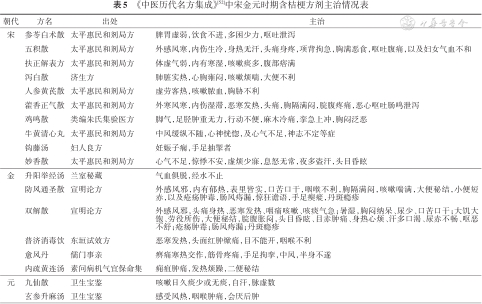 到了宋代,医学发展迅速,方书数量激增,很难用一部或两部方书代表宋代的方剂成就,以裘沛然主编的《中医历代名方集成》大概反映了宋代方剂成就,其中含桔梗的方剂如表5。
