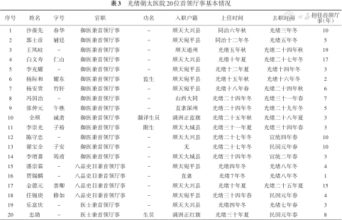 | 3 | 庄守和 | 左院判 | - | 顺天宛平县 | 光绪七年夏 | 光绪二十年夏 | 13 |