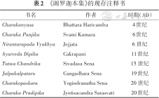 阇罗迦(Caraka,公元前3—前2世纪)基于《如火氏教法》,将其编纂为《阇罗迦本集》(Caraka Samhita)主述内科。特里达巴拉(Dridhabala,公元4世纪)继又将《阇罗迦本集》进行编纂,并补充和完善了阇罗迦丢失或未完成的41个章节[26],全书共8卷120章,9 295颂,内容以3种不同的形式呈现,即会议纪要、师徒对话、叙述说明。该书在世界医学史上占有非常重要的地位,梵文注释书多达43种,现存全本或残本8种,见表2[31]。公元8世纪初,这本医书被翻译成阿拉伯文,随后又被翻译成波斯文、尼泊尔文、英文等。