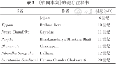 《妙闻本集》由川焰一系编撰。川焰的弟子妙闻(Susruta)、波阇(Bhoja)、阿乌帕谛那瓦(Aupadhenava)、阿乌拉布拉(Aurabhra)、卡拉维利亚(Karavirya)等都著有外科专著。在妙闻时期,外科成为阿育吠陀八分支中最重要的一支,其中鼻整形术流传较广。妙闻将川焰的讲授内容整理修订为《妙闻本集》(Susruta Samhita)主述外科,后由医学家龙树(Acharya Nagarjuna,公元4—5世纪)进行编纂,并补遗第6卷后续部(Uttara Tantra)的66个章节[26,32]。全书共6卷,186章,8 300颂,其注释书现存全本或残本7种,见表3[22]。该书先后被翻译成阿拉伯文、德文、英文和日文等。据《妙闻本集》记载,该时期皇家医生和皇室之间关系密切,皇家医生需要随时照顾皇室家庭,还要精通8个分支及相关理论和实践知识,否则不具备行医资格。书中还提到了疾病的起源及分类,某些疾病的症状、诊断及治疗,毒药及解毒剂,术前、术中及术后措施,灼烧、放血、刺络等特殊疗法,整形手术,骨折和脱位的治疗,白内障和其他眼科疾病的治疗,内科医生、外科医生及护士的相应职责和培训内容等[33]。
