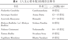 《八支心要本集》(Astanga Hrdaya Samhita,简称《八心集》)是《八支集》的精要本,共6卷,120章,7 120颂。该书影响较大,其注释书有30多种,现存全本或残本7种,见表4[36]。该典籍不仅在印度医学史上占有重要地位,还引起了阿拉伯、波斯、中国(西藏)和德国等国学者的关注,后被翻译成阿拉伯文、藏文、德文和英文等。古印度(现孟加拉国)高僧阿底峡(Atisa,982—1054)于1042年到达西藏传播佛法,他带来了《八支心要本集》及其注释本《月光》(Padartha Candrika)。随后,大译师仁青桑布(Rin—chen—bzang—po,958—1055)将上述2部医著译成藏文,并编入《丹珠尔》中。公元17世纪前后,《丹珠尔》传入蒙古地区,被译成蒙文,对蒙医药的发展产生了重要影响[34, 35]。
