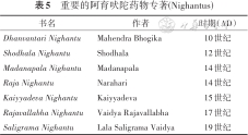 Nighantus以前指吠陀文献中的生难词汇,现指药物专著。公元7—20世纪,一共有38部重要的药物专著(Nighantus)作为对阿育吠陀医学经典的补充逐一问世[22,42]。笔者现例举部分著作,见表5[22]。