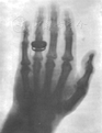 在伦琴发现X射线后的第4天,就有报道"一家医院曾应用伦琴射线在荧光屏上观察到一根进入患者手掌中的铁针,并顺利地取了出来"。1895年12月22日,伦琴将荧光纸板改换为照相干板,并简单拍摄了自己妻子戴有戒指的掌指骨,这是人类历史上第一张X射线照片(图2)[3]。1896年1月1日,伦琴将他拍摄的一些X射线片送给他的朋友们欣赏,这引起了全世界的震动,此后也引起过恐慌,当时传说X射线可以穿透妇女的衣服而窥视到人体内部。