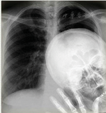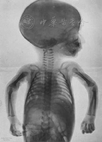 1896年1月23日,伦琴首次向外界展示自己的"X射线管"。1月27日,耶鲁大学的年轻医生亚瑟·赖特(Arthur Wright)实验性地成功拍摄了一张X光片[7],当时美国生理学家坎农(Walter Bradford Cannon)还是哈佛大学医学院的学生,他最早开始用荧光屏跟随钡剂通过动物的消化系统进行研究,这可能与托马斯·阿尔瓦·爱迪生发明X射线荧光屏是同一年[8]。1月29日,美国人格拉布(Émil H. Grubbe)等[9]首次将X射线用于皮肤癌的治疗;2月3日,美国的埃德温(Edwin Frost)兄弟和加拿大的考克斯(John Cox)先后将X射线机用于疾病的诊断,同月有人用X射线第一次拍摄到了子宫内胎儿的图像[1,10]。1896年2月7日,在英格兰的利物浦大学,医生为一个12岁的男孩探察手腕中子弹位置(枪伤),并确认子弹在第三腕掌关节[11]。图4是1896年5月不正当应用情况下拍摄的幼儿X射线照片,该照片当时发表在临床投影档案杂志[12]。图5是德国人1896年设计的用于观察手部骨骼损伤的简易X射线荧光镜[12]。