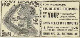 20世纪三四十年代,美国人用X射线照射治疗儿童胸腺增大症导致的胸部和甲状腺癌;伦敦一家医院在1939–1955年间治疗了1 432例强直性脊柱炎患者,发现有骨髓抑制和血液肿瘤,那个年代X射线照射的治疗时间要持续2 h左右,患者受照剂量非常大[17]。当时,媒体还吹嘘"神秘的X射线"能够缓解疼痛,承诺可以治疗多种疾病,包括治疗皮肤瑕疵的美容疗法、治疗阳痿和药物成瘾性的治疗等。在20世纪早期,国外发达国家滥用放射线的现象比较普遍。比如,一些贵族妇女将自己健康情况下拍摄的X光片作为礼物送给友人,欧洲当时用X射线直接照射妇女眼部治疗面部上皮瘤(图6)。图7为治疗头痛的媒体广告。