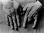 20世纪50年代前,人们对放射线对人体损害重视不够,使用的X射线设备十分简陋,X射线机采用热阴极气体真空玻璃管,没有射线准直系统。在此后的十几年里,X射线摄影工作者均没有考虑放射防护的安全问题,放射科室多在阴暗潮湿的地下室,X射线管受潮经常出故障。1898年,英国伦敦皇家医院的医生Harnack和3名助手,在没有任何防护的条件下开始使用X射线机,5年后他们全部出现放射损伤,其中一名死亡,一名患双手放射性皮炎最终截肢(图9)[3]。