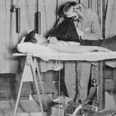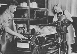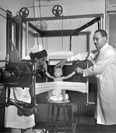 这些沉痛的代价让人了解到了X射线的另一个方面––"X射线的危害性",以至于早期就投入X射线研究的大发明家托马斯·爱迪生和他的助手麦迪逊(Clarence Madison Dally)以及米伦·卡萨宾(Mihran Kassabian)等长期从事X射线管实验工作,1990年后2人手部均患皮肤癌症。1903年,当记者问及爱迪生该"事件"真相时,爱迪生痛心地回答说,"别再跟我再谈X射线了……我怕它们………!!"。图10,图11,图12,图13是早期不正当使用X射线机的情况,其中图10为1903年医生在无任何防护条件下进行的胸部X射线透视的操作,该图床下的X射线管是4π立体角发射的无准直操作,医生也没有任何防护措施。图11是50年代在英国简易防护条件下进行的近距离透视操作,但医生有了铅手套和铅围裙等简单防护。在我国,这种透视操作直到80年代初期才禁止。图12是美国部队医院使用移动式床前X射线机为士兵做X射线检查留下的珍贵历史照片;图13是医生和护士用布带固定幼儿来拍摄X射线片的操作。