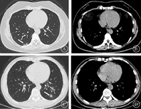 常规组:采用西门子128排CT机,常规螺旋扫描模式,固定管电压120 kV,参考管电流110 mA,螺距1.2,X射线管旋转时间0.5 s/周,探测器准直128×0.6 mm。获得的图像采用滤波反投影法(FBP),肺窗选B70f,纵隔窗选B30f。
