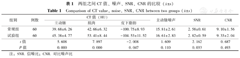 试验组患者主动脉(根部水平)、脊柱后方肌肉的CT值及主动脉(根部水平)SNR分别为(45.38±4.77)HU、(53.41±8.44)HU、2.82±0.59,常规组分别为(39.68±6.26)HU、(42.66±6.32)HU、2.58±0.61,试验组明显高于常规组,差异有统计学意义(t=5.608、7.897、2.162,P<0.05)。试验组皮下脂肪CT值为(-104.53±11.52)HU,常规组为(-100.75±8.93)HU,试验组低于常规组,差异有统计学意义(t=-2.008,P<0.05)。主动脉(根部水平)噪声、CNR差异均无统计学意义(P>0.05,表1)。