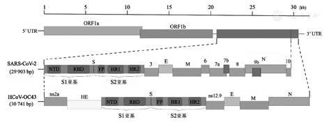 HCoV-OC43和SARS-CoV-2均属于β冠状病毒属,基因组RNA具有54.2%的核苷酸同源性[31],包含多个开放阅读框(open reading frames, ORFs),靠近5′端的ORF1a和ORF1b在两种冠状病毒中高度保守,占整个基因组大小约2/3,两ORF编码的多聚蛋白可以剪切为16个非结构蛋白,参与病毒的转录和复制(图2)。靠近3′端的ORFs在两者中则分别编码变异程度较大结构蛋白和附属蛋白,其中4种共有的结构蛋白包括刺突蛋白(spike protein, S)[32]、包膜蛋白(envelope protein, E)[33]、膜糖蛋白(membrane glycoprotein, M)[34]和核蛋白(nucleocapsid, N)[35],均在病毒复制过程中发挥关键作用。不参与复制的附属蛋白,在感染宿主的过程中发挥着特定的调控作用[36]。