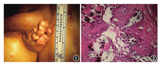 患者,男,45岁。2016年1月4日因发现阴囊皮肤肿物10年余入院。10年前无明显诱因阴囊皮肤出现一米粒样大小肿物,无红、肿、热、痛,未予治疗。肿物进行性增大,阴囊皮肤其他部位相继出现大小不等的类似肿物。7 d前,1个肿物破溃伴黄色分泌物就诊。查体:阴囊皮肤表面数个不规则肿物,无触痛,其中一个表面破溃,伴黄色液体流出,肿物质韧,随阴囊皮肤移动,较大约4.0 cm(图1)。双侧睾丸及附睾未及触痛及结节。彩色多普勒超声检查:双侧睾丸、附睾形态规则,包膜完整,回声均匀,未见异常血流信号。实验室检查:血尿常规、肝肾功、电解质等未见异常。胸部X线片、心电图、泌尿系彩色多普勒超声检查未见异常。术前诊断为阴囊皮质纤维瘤。