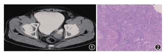 患者,男,59岁,2015年11月11日因排尿不畅伴尿痛2年,肉眼血尿2 d入院。患者入院前5个月曾因排尿不畅伴尿痛行膀胱镜检查,见膀胱左侧壁一直径约2.5 cm憩室,邻近左输尿管开口,当时予保守治疗改善排尿症状。查体:耻骨上区未及明显充盈,深压痛(+)。直肠指检:前列腺Ⅰ°大,质韧,未及结节,无触痛,中央沟变浅,指套无染血。尿常规检查:尿潜血(3+),尿白细胞(3+),尿蛋白(+)。B超检查示前列腺增生伴钙化,膀胱憩室。尿流率检测:最大尿流率14.6 ml/min。盆腔CT检查:膀胱左后方憩室,憩室壁欠规整、增厚(图1)。术前诊断为膀胱憩室伴感染,前列腺增生。全麻下行膀胱憩室切除术+左输尿管膀胱再植术。病理检查:灰白色囊壁样组织,大小约8.0 cm×5.0 cm×0.4 cm,囊内壁光滑,局灶咖啡色。镜下见(膀胱憩室)浸润性低分化尿路上皮癌累及送检膀胱憩室壁全层。于2周后行根治性全膀胱切除术+双侧输尿管皮肤造口术。病理检查:膀胱约8.0 cm×7.0 cm×5.0 cm,膀胱左下壁厚、质硬,切面灰白,质硬区范围4.0 cm×3.0 cm;见完整双侧精囊腺及前列腺,左盆腔淋巴结2枚。镜下见膀胱憩室化生性癌,部分区域为浸润性高级别尿路上皮癌,部分区域为鳞状细胞癌,部分区域为骨肉瘤(图2);癌组织紧邻左侧精囊腺,左输精管及右精囊腺未见癌浸润;前列腺未见癌浸润;左盆腔淋巴结2枚未见癌转移。免疫组化染色检查:CKp(++),CK7(+++),P40(+),CK5/6(+)。术后予辅助盆腔放疗,累计照射5 000cGy/25次,予紫杉醇脂质体+顺铂辅助化疗2个周期。术后随访6个月未见肿瘤复发。