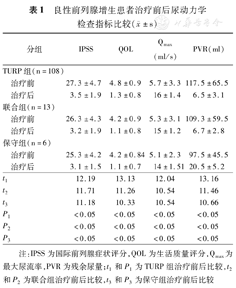 注:IPSS为国际前列腺症状评分,QOL为生活质量评分,Qmax为最大尿流率,PVR为残余尿量;t1和P1为TURP组治疗前后比较,t2和P2为联合组治疗前后比较,t3和P3为保守组治疗前后比较
