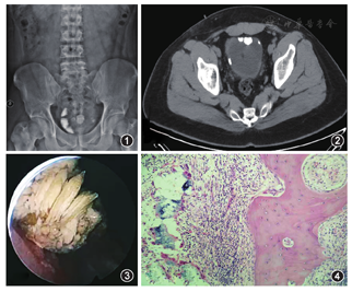 蛛网膜下腔麻醉下行膀胱切开取石术,术中见膀胱结石与膀胱黏膜紧密粘连,周围黏膜充血水肿,依次钝性分离并取出结石,结石粘连处膀胱黏膜组织红肿糜烂且局部僵硬,切除部分病变黏膜送病理检查,创面以3-0可吸收线间断缝合。术后结石成分分析:一水草酸钙、碳酸磷灰石。术后病理检查:(结石嵌顿处膀胱黏膜)纤维、脂肪及血管组织伴骨化,间质慢性炎细胞浸润,并见多核巨细胞反应(图4)。术后3个月复查,患者诉排尿顺畅,尿常规WBC 3个/HPF;泌尿系彩色多普勒超声检查示膀胱充盈良好,无明显异常,无残余尿。