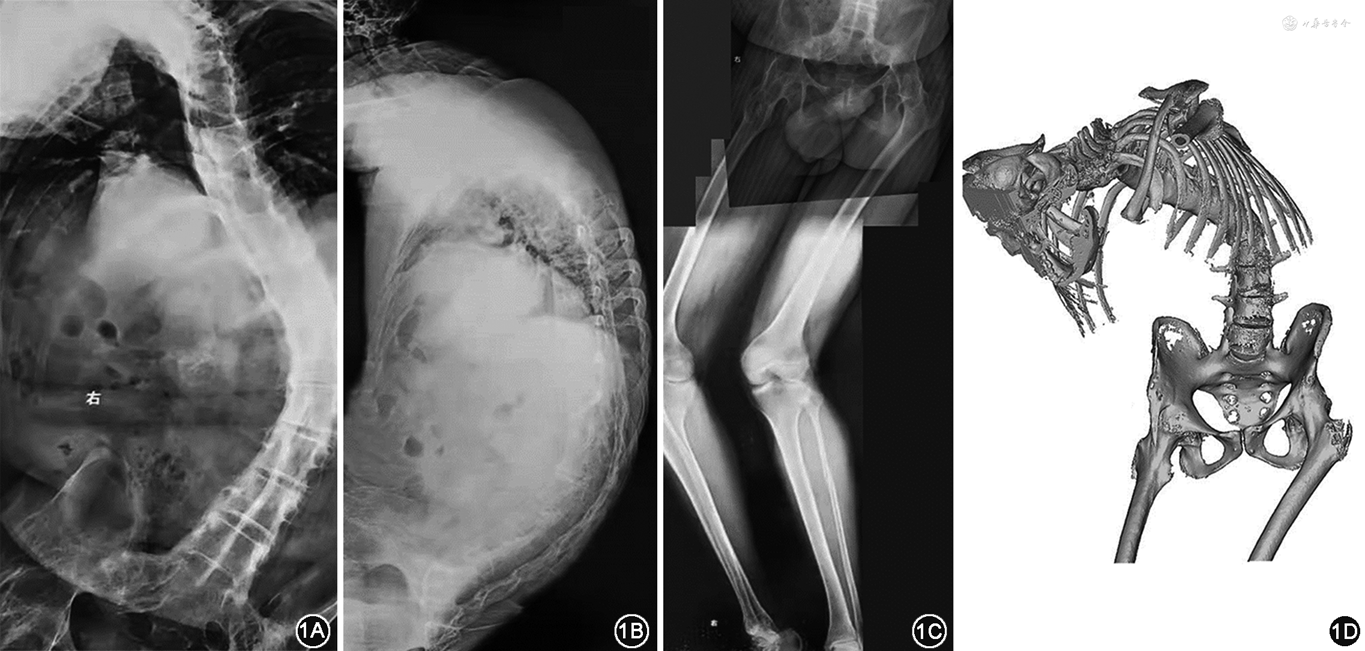 患者 男性,33岁,因“强直性脊柱炎20年,双侧髋关节强直、脊柱侧后凸10年”于2021年4月20日入院。患者13岁确诊强直性脊柱炎,10年前进展至以双侧髋关节屈曲位强直和脊柱侧后凸融合为特征的“剃刀背”畸形,并丧失竖直站立外观和双髋关节活动能力,行走能力严重受限,无法平视和仰卧。腰椎及双侧髋关节活动度丧失,双侧膝关节活动度0°~130°,双侧踝关节背伸20°,跖屈45°,行走时主要为双足跖跗关节和双踝关节屈伸活动。影像学检查:脊柱全长正、侧位片可见典型竹节样改变。冠状位、矢状位严重失平衡,顶椎位于L1~2椎间盘,上端椎位于T10,下端椎位于L4。骨盆前后位X线片示双侧骶髂关节间隙破坏(4级),骨盆极度后倾,双侧髋关节融合于屈曲45°,右侧外旋25°,左侧内旋30°(图1)。实验室检查:白细胞计数7.84×109/L,中性粒细胞百分比57.6%,血红蛋白161 g/L,C反应蛋白12.2 mg/L,红细胞沉降率2 mm/1 h,人类白细胞抗原B27(+),类风湿因子(-),抗核抗体谱(-)。诊断:强直性脊柱炎(终末期),脊柱侧凸后凸畸形并骨性融合,双侧髋关节破坏并骨性融合。