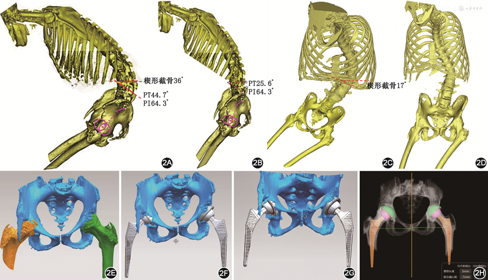 由脊柱、关节医师联合麻醉、风湿免疫、营养、影像、康复、药剂科医师组成多学科诊疗团队,进行术前规划与治疗方案制定。由于患者存在严重髋-脊复合病变,髋关节高度屈曲内旋位融合,行俯卧位下脊柱矫形手术困难,故采用先髋后脊的分期手术方法,即一期完成髋关节开放截骨、软组织平衡和全髋关节置换,功能训练初步获得髋关节主动功能后,二期行脊柱矫形手术。术前使用Mimics 21.0软件(比利时Materialise公司)行脊柱全长、骨盆及髋关节CT三维重建,将三维重建影像投射为二维影像后导入Surgimap 2.2.15.5软件(美国Nemaris公司)进行脊柱矫形截骨设计,确定脊柱侧、后凸矫形角度,预估L3经椎弓根椎体截骨术截骨36°后,骨盆倾斜角纠正18.7°(图2)。但冠状面和矢状面的畸形成角常合并轴位旋转畸形,很难通过X线片和CT三维重建图像进行模拟和预测。为提高术中矫正的准确度,术前通过三维打印脊柱模型进行手术操作的反复推演。根据脊柱矫形手术在冠状面和矢状面的矫正幅度,模拟骨盆及髋关节矫形后的三维形态[1],在该对线关系下按标准假体植入角度(外展40°和前倾15°),使用人工智能辅助规划软件AI HIP(北京长木谷医疗科技有限公司)完成假体方位设计[2],分析髋臼假体与髋臼前后壁的覆盖和交错关系。在髋关节过伸10°和屈曲90°两个体位模拟股骨近端与髋臼前部和坐骨结节的接触关系,模拟假体安全区并进行安全测试,由此预测撞击部位、制定术中操作预案和术后康复注意事项。再将骨盆的矢状面倾斜度还原至脊柱术前状态,从而确定患者髋关节手术的假体植入方位(术前规划假体方位为外展50°,前倾0°,图2)。