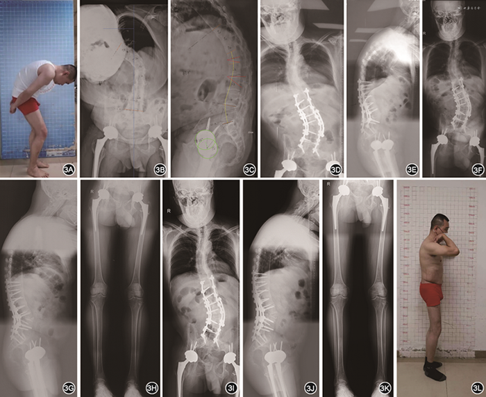 术后6周,患者双侧髋关节屈伸活动度为主动0°~50°,被动0°~70°,屈髋、外展肌力4级。C反应蛋白6 mg/L,红细胞沉降率 8 mm/1 h,血红蛋白116 g/L,无强直性脊柱炎活动期表现,考虑适宜行脊柱矫形手术。故于2021年4月20日行俯卧位脊柱截骨矫形内固定术。于T10~L2、L4~S1双侧置椎弓根螺钉,常规棒连接;T12~L4连接卫星棒。于L3行经椎弓根椎体截骨术矫正后凸,恢复腰椎前凸30°~35°;L1行PONTE截骨,L1~2行经椎间隙不对称截骨,恢复腰椎前凸15°~20°。L2行不对称截骨矫正冠状位侧弯,切除L1~2椎间盘,切除L2部分椎弓根、上终板和部分椎体,凸侧截骨量大于凹侧;T10~S1后外侧植骨。术中联合运动电位、感觉电位和自由肌电监测术中脊髓功能。术后卧床1周后下地,佩戴胸腰支具辅助活动3个月。