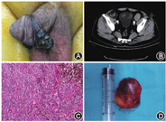 患者,男,66岁。因阴茎外伤20个月,发现阴茎肿物14个月于2020年4月2日入院。患者20个月前因跌倒致阴茎腹侧皮肤擦伤,皮肤破损面积约1.0 cm×1.0 cm,患者自行消毒,皮损处愈合差;14个月前皮损处出现大小约0.3 cm×0.3 cm肿物,后肿物无明显变化,无其他不适,故未诊治。入院前1个月阴茎肿物增大明显伴皮肤破溃渗出,遂就诊。查体:阴茎腹侧可见2处大小分别约6.0 cm×4.0 cm×3.0 cm、3.0 cm×2.0 cm×2.0 cm黑色菜花样肿物,表面破溃,基底窄(图1A),左侧腹股沟区可触及大小约5.0 cm×4.0 cm×4.0 cm肿物,质韧,活动度可。盆腔增强CT检查:阴茎内可见不规则软组织密度影,增强扫描不均匀强化,双侧腹股沟区、左侧髂血管旁可见多发肿大淋巴结(图1B),胸腹部CT检查未见明显异常。血、尿常规等检查未见明显异常。