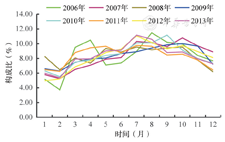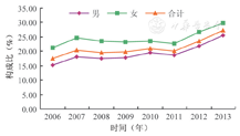 2006-2011年非机动车道路交通伤害病例占当年道路交通伤害病例的比例波动较平稳,2013年较2012年比例上升。非机动车道路交通伤害病例以男性为主,多为青壮年人群,应根据非机动车道路交通伤害病例的性别、年龄差异开展有针对性的预防措施。