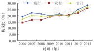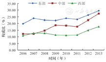按经济发展水平将我国大陆划分东、中、西三大经济地带[7]。2006-2011年东部、中部和西部地区非机动车道路交通伤害病例占道路交通伤害比例波动较平稳。2013年东部地区非机动车道路交通伤害病例占道路交通伤害病例的比例最高(29.61%),中部地区次之(27.28%),西部地区最低(17.71%),见图3。