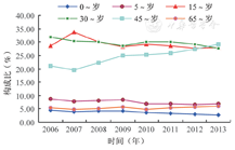 非机动车道路交通伤害病例以男性为主,2006-2013年因非机动车道路交通伤害病例的性别比分别为1.29、1.30、1.32、1.32、1.43、1.44、1.35和1.39,就诊病例多集中在15~64岁年龄组(图4)。