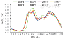 2006-2013年非机动车道路交通伤害病例的季节分布和时间分布基本一致。非机动车道路交通伤害病例数多从2月开始增加,至7-10月达到最多,随后逐渐下降(图5)。2013年以第三季度报告的非机动车道路交通伤害病例为最多,第一季度最少(2013年1~4季度报告的非机动车道路交通伤害病例的比例分别为19.27%、26.09%、30.56%和24.08%)。伤害发生的时点分布以07:00迅速增加,至10:00达最高,20:00迅速减少,至次日04:00达最低(图6)。