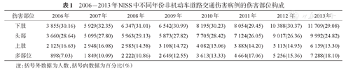 2006-2013年NISS中不同年份非机动车道路交通伤害病例的伤害部位构成
