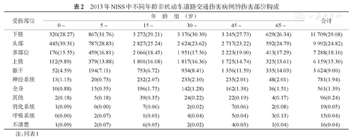 2013年NISS中不同年龄非机动车道路交通伤害病例的伤害部位构成