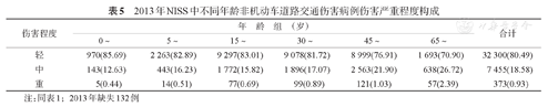 2013年NISS中不同年龄非机动车道路交通伤害病例伤害严重程度构成