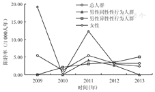 根据性别和性取向将研究对象分为男性同性性行为者、男性异性性行为者和女性3类,分别对3类人群2009-2013年配偶HIV血清学阳转情况进行分析:男性异性性行为配偶HIV血清学阳转率(/1 000人年)分别为0、2.13、3.13、3.49和5.05,呈逐年上升趋势;女性配偶HIV血清学阳转率分别为19.17、0、12.24、3.11、2.35,见图1。