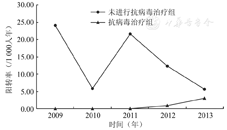 对抗病毒治疗组和未进行抗病毒治疗组配偶HIV血清学阳转分析结果显示,未进行抗病毒治疗组配偶HIV阳转率从2009年24.10/1 000人年、下降至2013年5.56/1 000人年;抗病毒治疗组2009-2013年配偶阳转率(/1 000人年)分别为0、0、0、0.81、3.03,见图2。