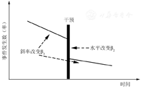 在统计分析时,ITS分析对干预实施前和实施后两个时间段进行线性回归分析,分析干预因素作用的水平改变和斜率改变,应用间断线性回归模型(segmented linear regression model)[3],见图2。此分析可检验试验前后在干预点水平下降或升高的幅度是否有统计学意义,及在干预实施后某事件率或数随时间下降或上升的斜率是否与试验前不同,其主要优势是控制了试验前某事件率或数已随时间下降或上升的趋势。当时间序列数据在干预前和干预后呈现线性趋势时,可应用线性回归模型来拟合数据,探讨干预措施对结果变量的影响。