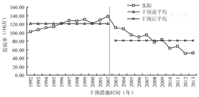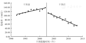 均<0.000 1,差异有统计学意义。干预前斜率是3.124,呈上升趋势;干预后,斜率是+3.124-9.187=-6.063,呈下降趋势;斜率改变量为