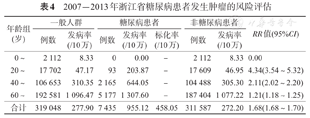 利用2007-2013年人群糖尿病、肿瘤发病监测和生存随访队列资料,建立糖尿病患者肿瘤发病数据库,计算糖尿病患者肿瘤发病率、一般人群肿瘤发病率、糖尿病患者肿瘤发生相对危险度(RR)。以2007-2013年浙江省卫生区监测人口构成作为标准人口,计算标准化发病率。