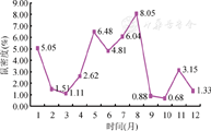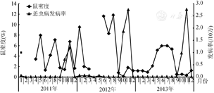 2011-2013年沿海滩涂地区的鼠种分布有褐家鼠、小家鼠、黑线姬鼠。其中黑线姬鼠为优势鼠种,构成比为89.19%(429/481);褐家鼠、小家鼠和鼩鼱的构成比分别为4.57%(22/481)、2.70%(13/481)、3.53%(17/481)。鼠密度呈现冬季与夏季2个高峰(图3)。冬季高峰月份为1月,鼠密度为5.05%;夏季高峰自5月持续至8月,鼠密度最高的8月为8.05%。2011-2013年沿海地区恙虫病发病的时间分布,以每年的10-11月有1个高峰,每次的发病高峰前1~ 2个月均有1个鼠密度升高趋势。