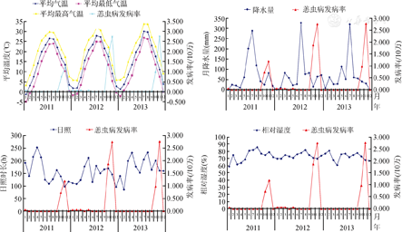 2011 - 2013年月均气温、平均最高气温、平均最低气温(tmin)的高峰月份均在7月,分别为28.13 ℃、31.73 ℃、25.13 ℃;平均相对湿度和平均日照时间的最高月份均在8月,相对湿度(hum)和日照时间(sun)分别为81.00%、169.37 h;平均降水量和降水天数最高月份均在7月,分别为311.67 mm和13.00 d。从气象因素与恙虫病月发病率分布图所示(图5),每次恙虫病发病高峰前均有一个气温、降水量(rain)高峰,而sun、hum则无上述一致性。