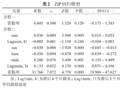 根据恙虫病发病报告病例的数据特征,选择建立具有Poisson分布类型的模型,通过非嵌套模型选择的Vuong检验方法,得出V=1.98>1.96,可以认为选择ZIP模型建立2011-2013年盐城市沿海滩涂地区气象因素对恙虫病发病病例影响的回归模型更合适(表2)。