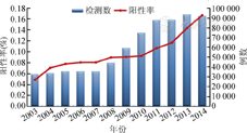 2013年北京市新发现的HIV/AIDS主要来自医疗机构,占58.3%[11]。本研究分析数据来源于协和医院就诊的患者,HIV检测数达70余万人次。就诊患者有70%以上来自外地(感染内科的就诊患者90%以上来自外地),具有一定的人群代表性。本研究中,2014年就诊患者HIV检测阳性率(0.17%)是2003年(0.05%)的3.40倍,为全国同期数据(0.058%)的近3倍[1]。HIV检测阳性率及增长趋势均高于国家卫生和计划生育委员会报告的数据,可作为现有艾滋病疫情评估重要的补充,提示大型综合性医院的HIV检测也是发现HIV/AIDS的有效途径。