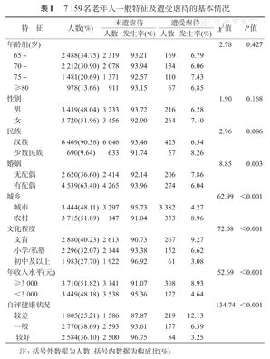 在7 159名调查对象中,男性3 439人(48.04%),女性3 720人(51.96%);年龄在65~69岁2 488人(34.75%)、70~74岁2 212人(30.90%)、75~79岁1 481人(20.69%)、≥80岁978人(13.66%)。其中,汉族90.36%,有配偶的占63.40%,居住在城市的占48.11%,文化程度为文盲和小学/私塾的分别占40.23%和32.07%,收入较高的占48.18%,自评健康一般、较好者分别占38.69%和36.10%(表1)。